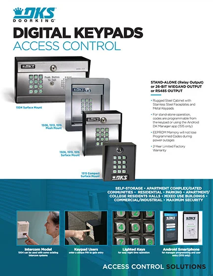 The DKS Smart Open app allows users to access their model 1515 controlled entry point with their Android smart phone or they can enter their personal code on the 1515 keypad. The Digital Lock Manager app allows managers to program entry codes, hold open codes, etc. directly from their Android phone.