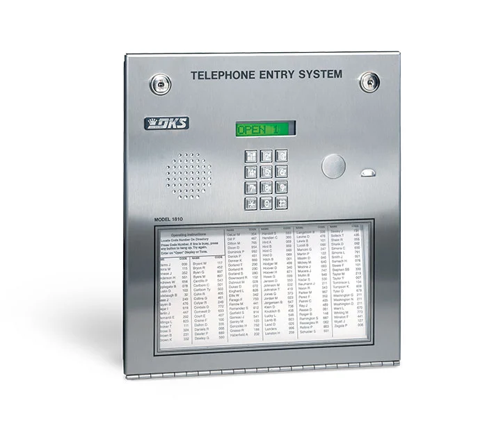 The DKS 1810 is an ideal Telephone Entry System that is suited for a wide variety of applications. The built-in lighted directory makes it a complete all-in-one compact unit and it is easy for managers to update by using a word processing program. Visitors are easily identified by voice communication and can be granted or denied access directly from a touch-tone telephone. Perfect for small to medium-sized apartment buildings, gated communities, condominiums, office buildings, factories and industrial sites.